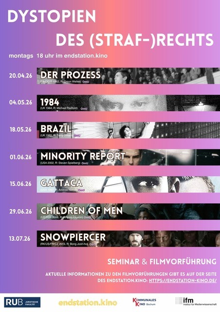 Was geschieht, wenn das Recht zum unkontrollierten Herrschaftsinstrument wird? Im Mittelpunkt der Filmreihe stehen Spielfilme, die dystopische Entwicklungen des (Straf-)Rechts verhandeln. Diese Inszenierungen machen sichtbar, was juristische Abhandlungen nur schwer vermitteln können: die Allgegenwart von Kontrolle, die Fragilität der Freiheit und die Ohnmacht des Individuums. Die Teilnehmenden des Seminars analysieren filmische Erzählungen über Entgleisungen des Rechts, stellen Bezüge zu realen Entwicklungen her und diskutieren, welche ästhetischen Formen das Kino findet, um den Verlust von Freiheit und Verlässlichkeit fühlbar zu machen.